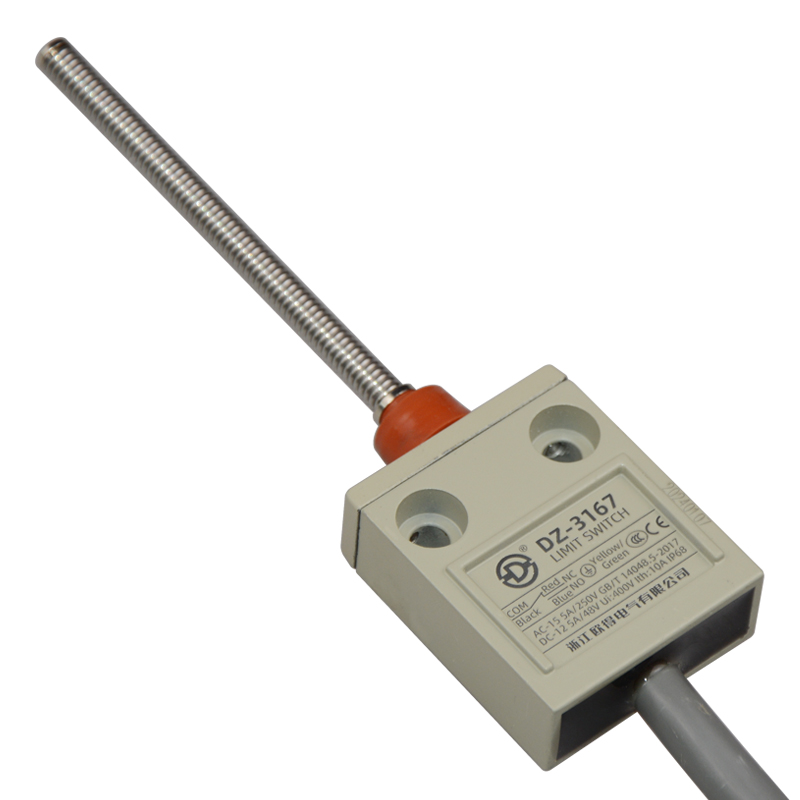 • DZ-3167防水行程開關(guān),盤簧型,萬向式,通用直立型,小型、薄形、IP68防護等級,樹脂與耐油軟線融合牢固,高度密封性兼具的緊湊型限位開關(guān)。適用于積水、潮濕環(huán)境下的機械設(shè)備,作位移電路通斷信號檢測控制。