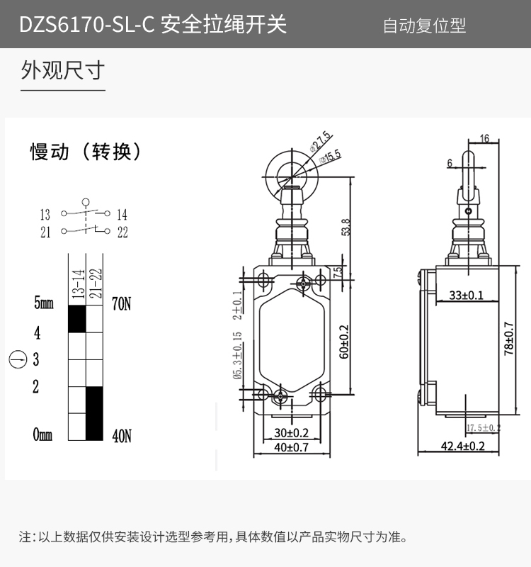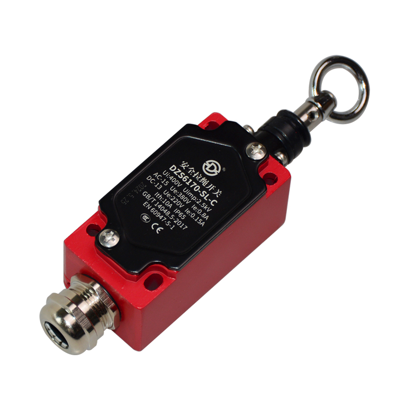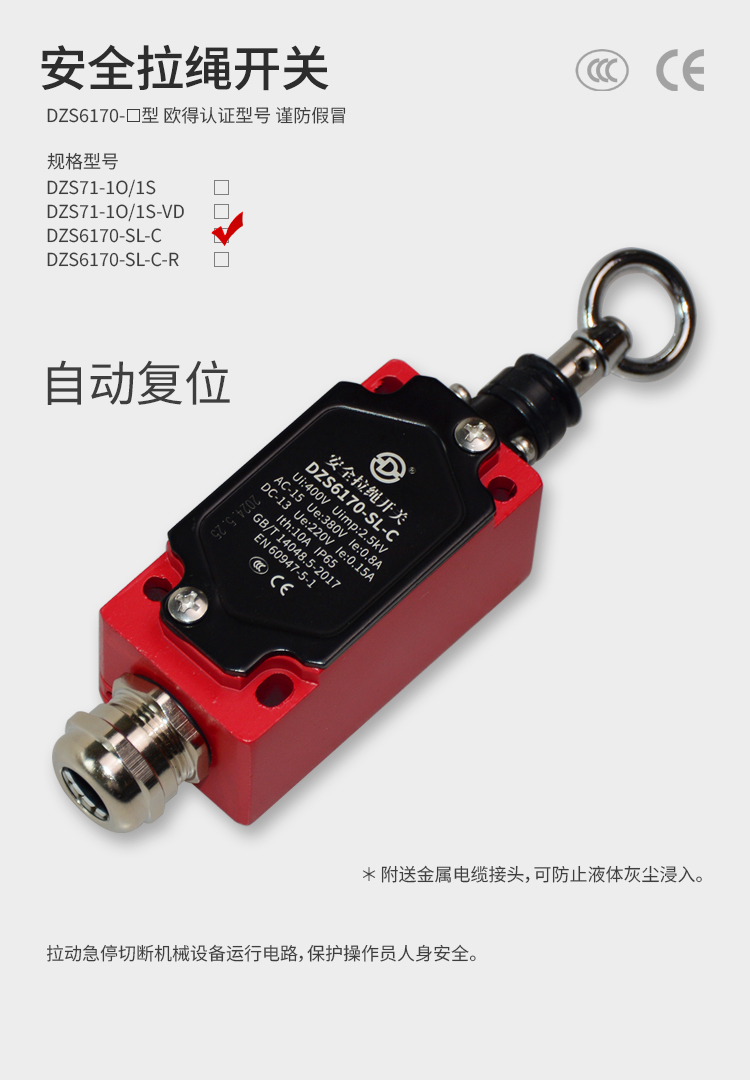 • DZS6170-SL-C安全拉繩開關(guān),拉動(dòng)式、自動(dòng)復(fù)位型。默認(rèn)接點(diǎn)為2回路(1常開1常閉)、可定制非標(biāo)2常閉(2NC)。金屬殼體,堅(jiān)固耐用。適用于流水線、輸送帶、高空作業(yè)車等機(jī)械設(shè)備位移信號控制,保護(hù)操作員不受機(jī)器傷害。額定絕緣電壓400伏,發(fā)熱電流10安培,工作電壓交流380伏、電流0.8安培,直流220伏、電流0.15安培,防護(hù)等級IP65,戶外使用請注意防水措施。