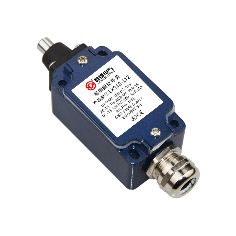 • LX918-11Z船用限位開(kāi)關(guān) 柱塞式 歐得行程開(kāi)關(guān)。額定絕緣電壓400伏,發(fā)熱電流10安培,工作電壓電流交流380伏、0.8安培,直流220伏、0.15安培,防護(hù)等級(jí)IP65。適用于船舶、海洋平臺(tái)、港口碼頭等各種機(jī)械設(shè)備在電器設(shè)備控制回路中能限制行程的限位開(kāi)關(guān)。