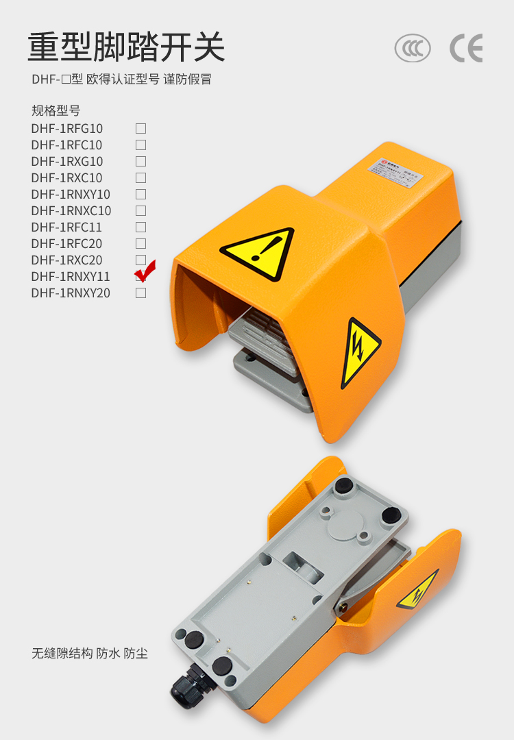 • DHF-1RNXY11腳踏開關(guān),三面防護(hù)罩,鑄鋁材質(zhì),加厚踩踏板,堅固耐用。適用于數(shù)控鍛壓機(jī)械設(shè)備電路信號通斷控制。額定絕緣電壓380伏,發(fā)熱電流15安培,工作電壓電流交流250伏、15安培,防護(hù)等級IP60。