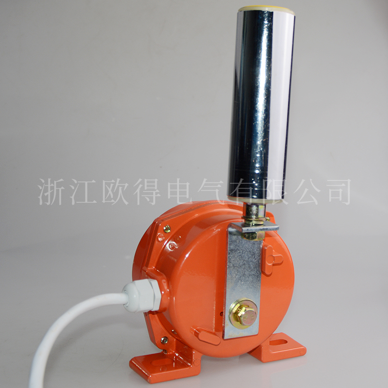 兩級跑偏開關(HFKPT1-20-30),絕緣電壓400伏,發(fā)熱電流10安培,工作電壓電流交流380伏、2.6安培,直流220伏、0.4安培,防護等級IP65。主要用于輸送機膠帶跑偏檢測,防止膠帶跑偏而造成物料溢出等故障。當膠帶發(fā)生跑偏時,膠帶邊緣帶動立棍旋轉(zhuǎn)并擠壓立棍使之傾斜。若立棍傾斜大于一級動作角度時,開關便發(fā)出一組信號用于警告,若立棍傾斜大于二級動作角度時,開關便發(fā)出另一組信號用于停機。膠帶機恢復正常運行后,立棍自動復位。